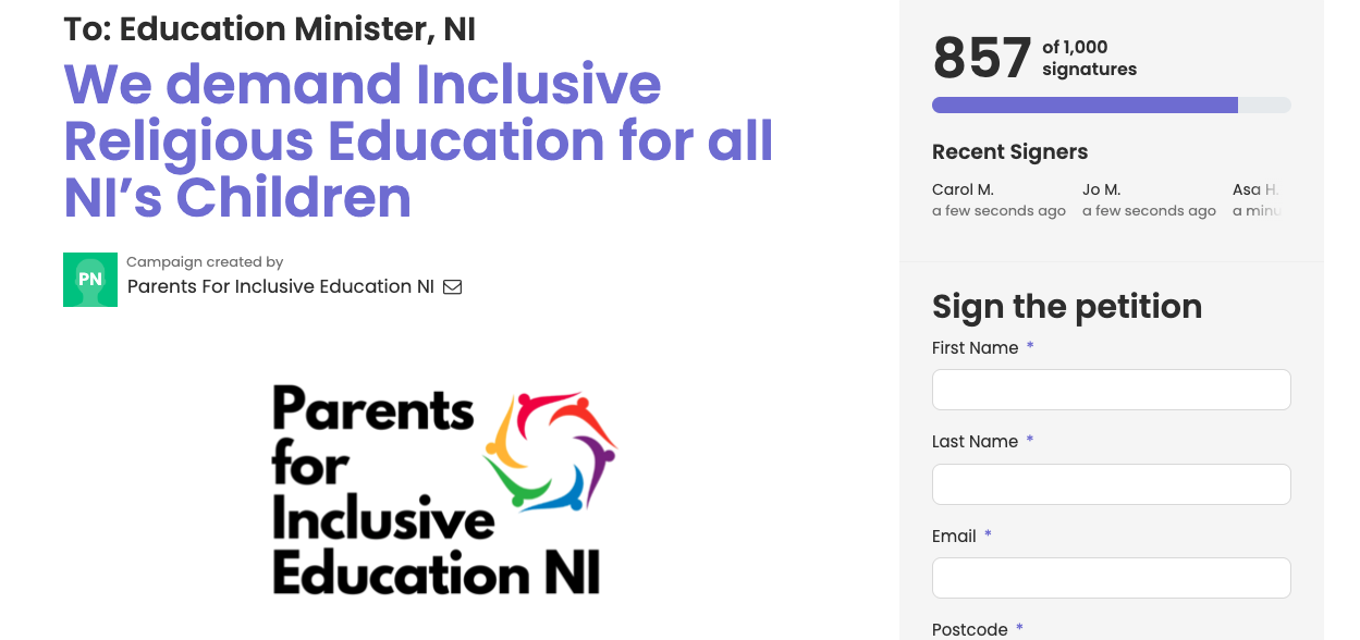 We have an extraordinary opportunity to shape the future of education in Northern Ireland and create an inclusive and respectful environment for all children, regardless of their religion. Together, we can build a community that stands up for change and advocates for an education system that celebrates diversity, fosters respect, and embraces every child's unique potential.